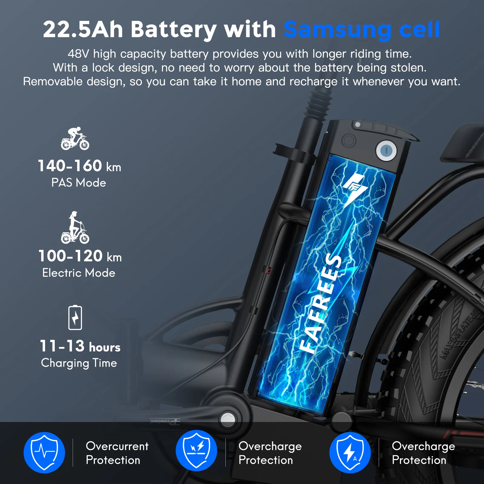 Comes with an advanced Samsung 48V 22.5Ah lithium-ion battery that fully charges in just 11 to 13 hours . With a lockout key. easy to remove and take home to charge. which can last up to 100-120km on a single charge with pure power assistance.