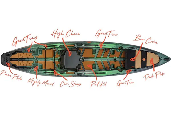 The fore tankwell features dual YakAttack GearTracs with Vertical Tie-Down Loops and Cam Straps for securing coolers. BlackPaks. and more. The aft tankwell features dual YakAttack GearTracs with adjustable bungees for everything else you need. The pass-through features two MightyMount II's for additional accessory mounting options. The stern features our Power Plate which was custom designed for this model—allowing the mounting of a Power Pole or various motor options.