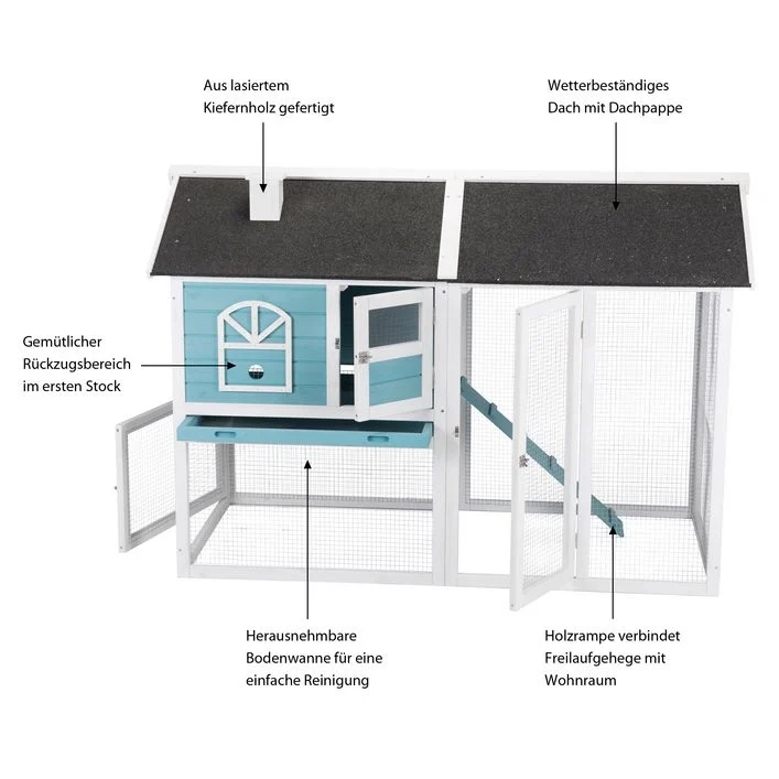 Der Kaninchenstall mit Freilaufgehege ist eine Bereicherung für Ihren Garten. In freundlichem Weiß und frischem Blau erinnert es an ein nordisches Ferienhaus. Das Dach schmückt sogar ein kleiner Kamin! Der hochwertige Stall wurde aus lasiertem Kiefernholz angefertigt und das Dach mit Dachpappe überzogen – er ist also wetterfest und eignet sich ideal zur Außenhaltung Ihrer kleinen Freunde.