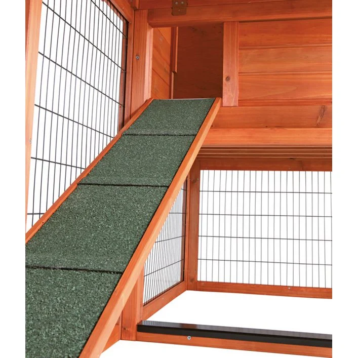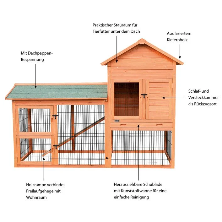 Spielen, Schlafen und Fressen unter einem Dach - für Kaninchen ist das Nagerheim Natura II von Trixie ein Traum. Der große Kaninchenstall bietet ein Freilaufgehege, in dem sich die Tiere auf dem Rasen bewegen können, sowie ein gemütliche Schlafhöhle, die für Kaninchen eine wichtige Rückzugsmöglchkeit darstellt. Der herausnehmbare Schubladenboden sorgt hier für eine komfortable Reinigung. Aus lasiertem Kiefernholz hergestellt und auf dem Dach mit Teerpappe bespannt, ist der Kaninchenstall bestens gegen Witterungseinflüsse geschützt. Unter dem Dach befindet sich zudem ein praktischer Stauraum für Tierfutter o.Ä.. Der Ausgang des Freilaufgeheges liegt ebenerdig, sodass Sie es mit einem zusätzlichen Gehege erweitern können.