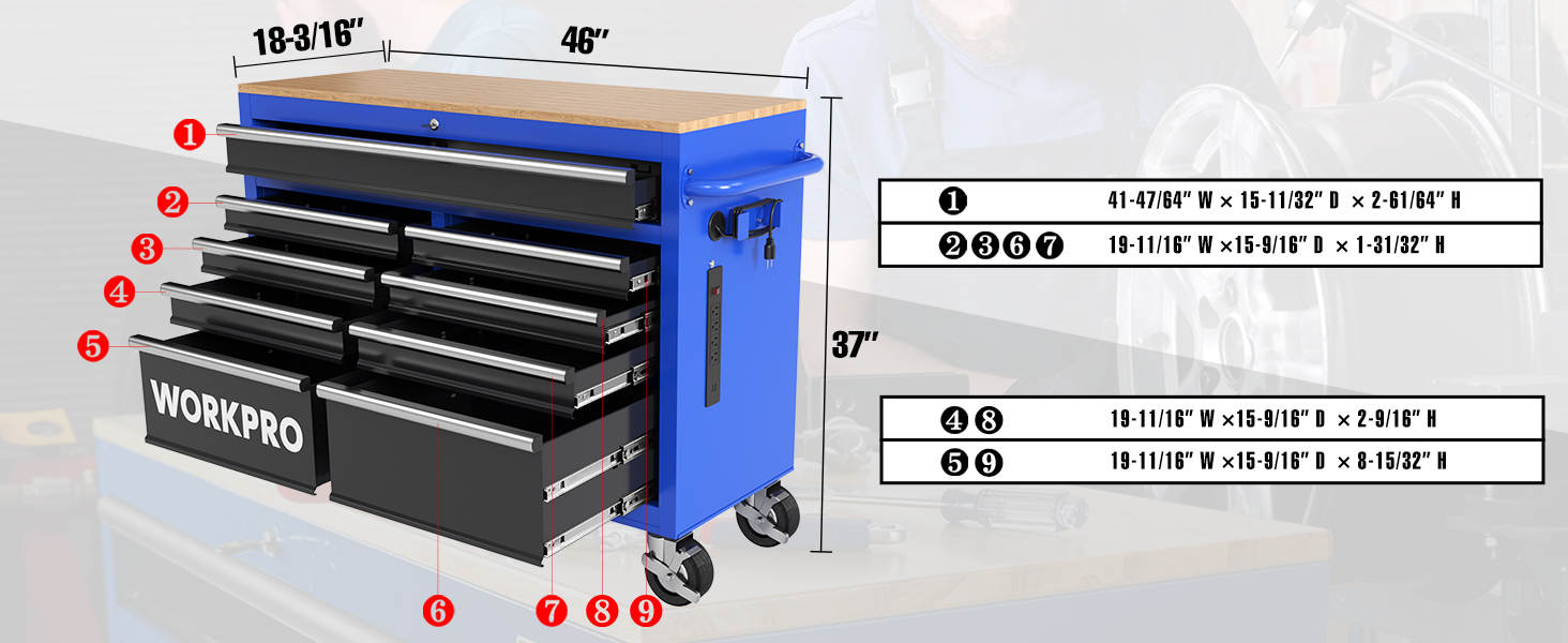 - 【46" 9 Drawers Tool Cabinet】 There are 9 drawers in this tool chest. providing enough storage to keep your expensive hand and power tools neat. The dimension of this item is 46"W × 18-3/16"D × 37"H. Here are dimensions of 9 drawers: ①41-47/64"W × 15-11/32"D × 2-61/64"H; ②③④⑤19-11/16"W × 15-9/16"D × 1-31/32"H; ⑥⑦19-11/16"W × 15-9/16"D × 2-9/16"H; ⑧⑨19-11/16"W × 15-9/16"D × 8-15/32"H. The area of the desktop is 830 sq.in.
