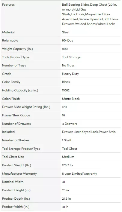 DetailIntroducing the all new Husky Industrial 41 in. W x 21.5 in. D 4-Drawer Tool Chest. Part of Husky's Professional Duty lineup. this chest has a heavy-duty 18-Gauge steel frame and is built to last. Each drawer is equipped with 120 lbs. rated ball-bearing slides that feature a soft-closing mechanism. Never worry about your drawers slamming and shut and tools moving around again. All drawers also have thick. pre-cut liners embossed with Husky logos to protect your tools. Inside the top hutch is an integrated power strip with USB ports and a magnetic back wall to place items for quick access. There is also a magnetic LED light strip that can be used to illuminate the interior of the hutch. Finally. combine this chest with the coordinating rolling cabinet (Model H41TR11HD. sold separately) for even more tool storage.